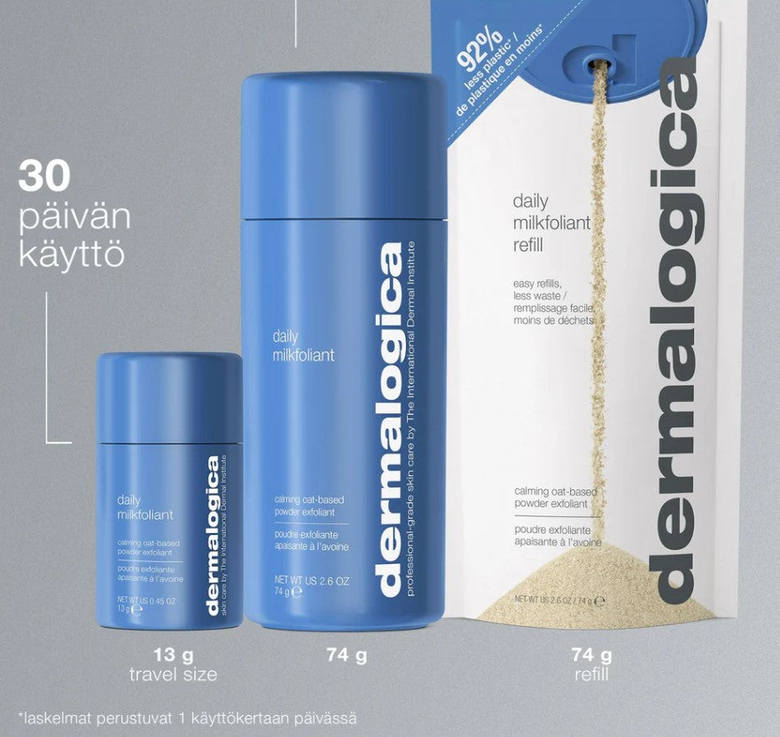 Dermalogica Daily Milkfoliant Kuorinta-aine (74 g) on hellävarainen, päivittäiseen käyttöön suunniteltu jauhemainen kasvojen kuorinta, joka aktivoituu veden kanssa. Maitohappoa, rauhoittavia kasviuutteita ja kauramaitoa hyödyntävä koostumus poistaa ihon pinnalta kuollutta ihosolukkoa, pehmentää ja kirkastaa ihoa ilman karheaa, hankaavaa tunnetta.