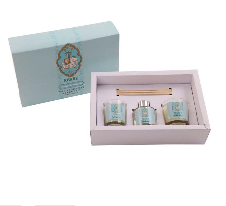 Kolmiosainen laadukas kodin tunnelmallinen kynttilä ja tuoksusetti merkiltä DKD Home Decor. Premium Diffuser and Candle set lahjasetti. Tuoksu Flower Power.