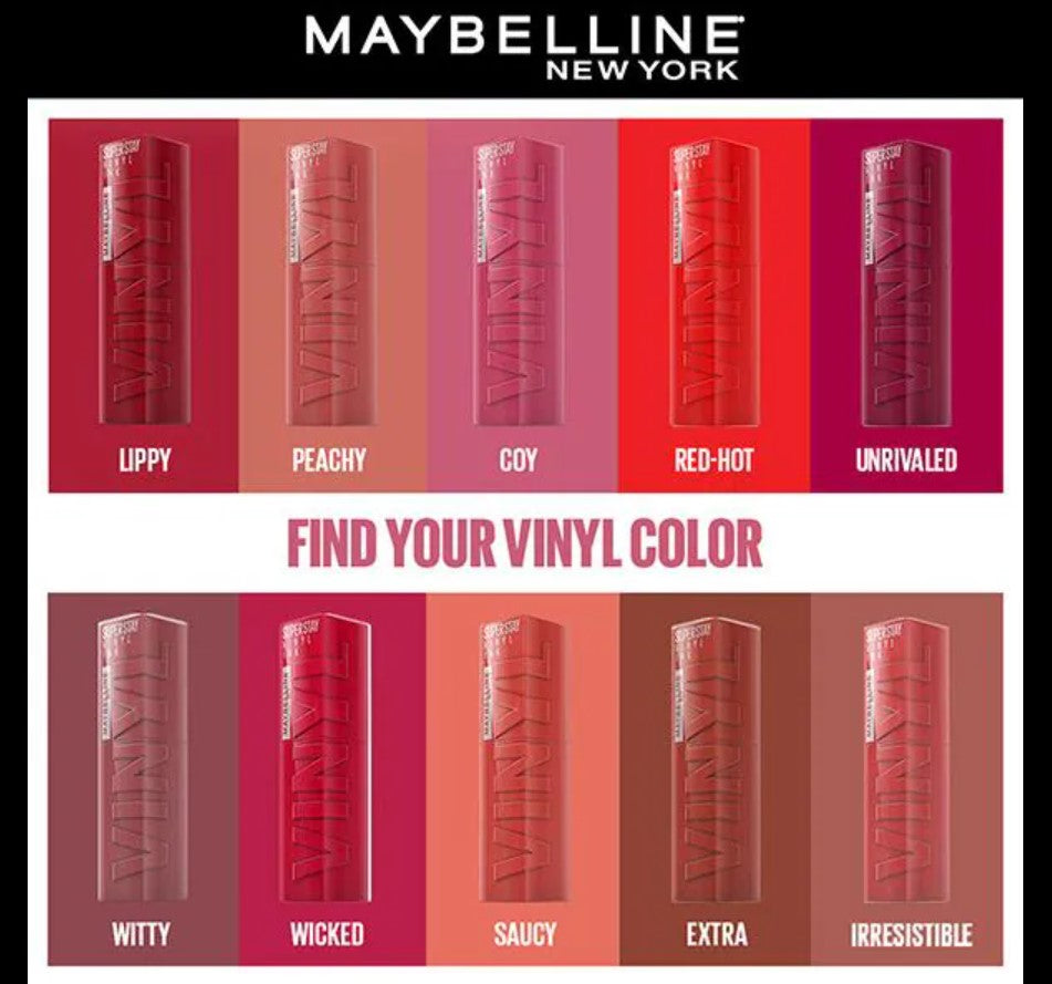 Maybelline Superstay Vinyl Ink – sävy Unrivaled 4,2 ml on pitkäkestoinen, vinyaalimaisen kiiltävä huuliväri, joka yhdistää nestemäisen huulipunan pysyvyyden ja kiiltopunan peilinkiillon. Ravistettava koostumus lukittuu huulille, jolloin väri pysyy intensiivisenä ja siistinä jopa tunteja ilman tahmeaa tunnetta.