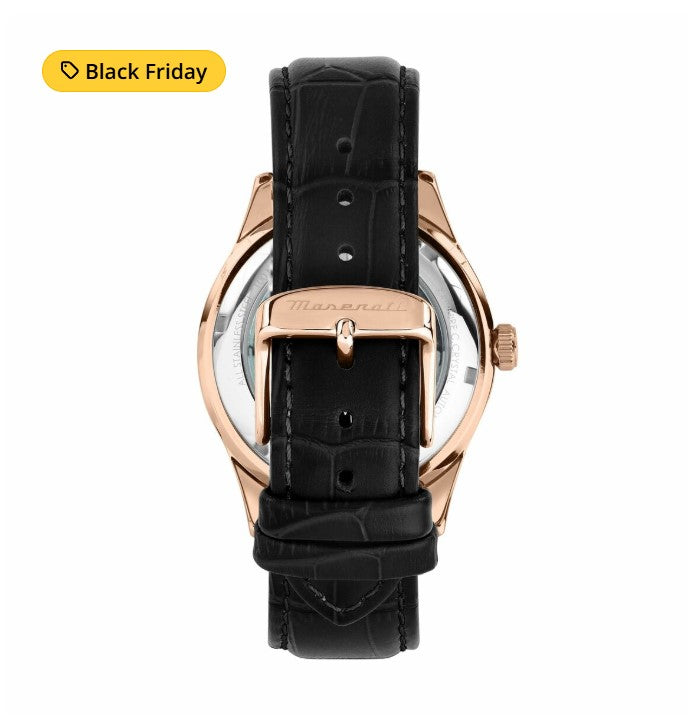 - Kellotaulu: Tyylikäs musta taulu, jossa Maseratin logo ja kontrastiset indeksit luovat ainutlaatuisen ilmeen.