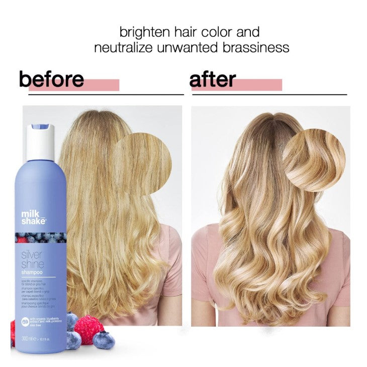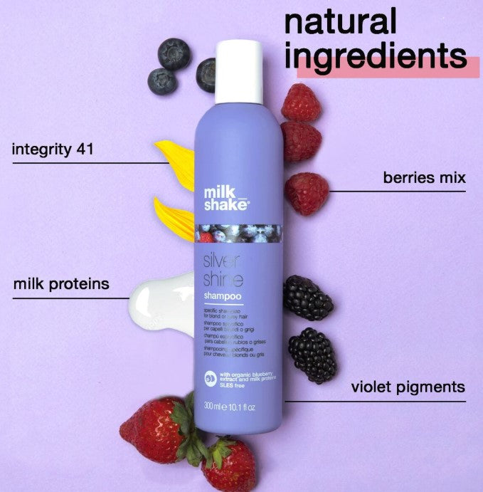 Milk_Shake Silver Shine Shampoo 1 L on erityisesti vaaleille, harmaille ja raidoitetuille hiuksille kehitetty hopeashampoo, joka neutraloi tehokkaasti ei‑toivottua keltaisuutta ja pitää hiussävyn viileänä ja raikkaana. Violettien pigmenttien ansiosta shampoo raikastaa sävyä ja auttaa ylläpitämään kauniin, puhtaan blondin tai harmaan ilman sameutta.