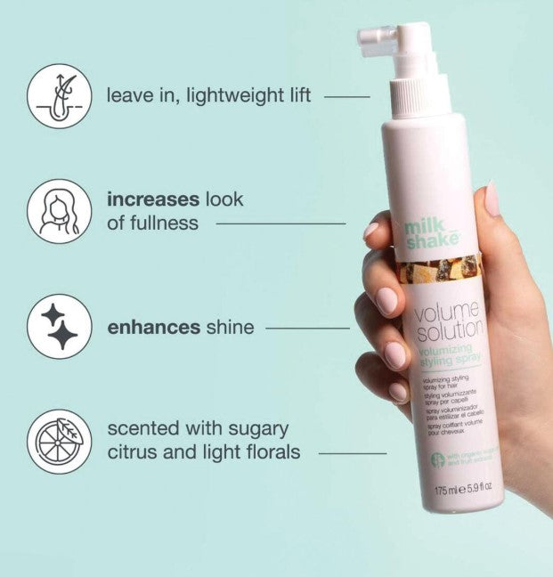 Milk_Shake Volume Solution Volumizing Styling Spray 175 ml on kevyt tyvisuihke, joka antaa hiuksille ilmavaa, pitkäkestoista volyymia ilman kovaa tai tahmeaa tunnetta. Suihke nostaa hiuksia tyvestä, lisää rakennetta ja tekee kampauksesta tuuheamman ja elävämmän näköisen, samalla kun maitoproteiinit ja hoitavat ainesosat suojaavat ja kosteuttavat hiusta.