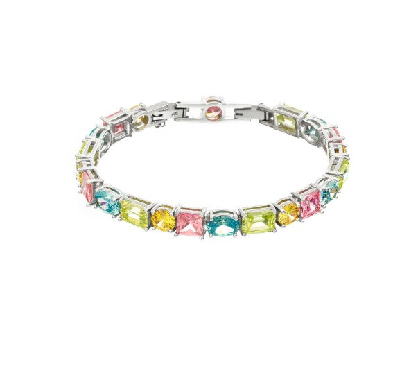 Rannekoru on valmistettu korkealaatuisesta metalliseoksesta, ja sen pinta on viimeistelty kiiltävällä rodium‑pinnoitteella, joka kestää aikaa ja säilyttää kirkkaan kiiltonsa. Korua koristavat moniväriset, eri muotoon hiotut kristallit – pinkit, vihreät, keltaiset ja turkoosit sävyt kimaltelevat elegantisti valon osuessa niihin.