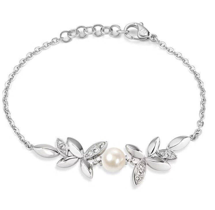 Rannekorua koristavat sirot lehtiaiheiset yksityiskohdat, joihin on istutettu säihkyviä kirkaskristalleja, ja korun keskellä loistaa valkea helmi – symboleina puhtaudesta ja harmoniasta. Korun herkkä hopeansävy ja kiiltävä pinta tekevät siitä täydellisen lisän niin arkeen kuin juhlaan.