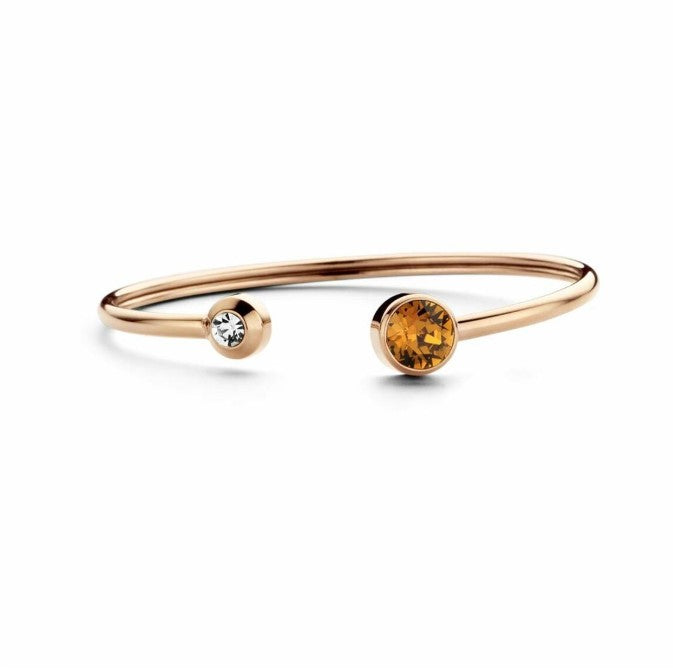 CO88 Collection -rannekoru tuo esiin yksinkertaisen, mutta tyylikkään muotoilun, joka sopii täydellisesti modernille naiselle. Koru on valmistettu ruusukultaisesta metallista, ja sen päät on koristeltu kahdella säihkyvällä kivellä – yksi kirkas ja yksi lämmin meripihkan sävyinen. Tämä hienostunut rannekoru on täydellinen lisä kaikkiin asukokonaisuuksiin, tuoden ripauksen ylellisyyttä ja charmia niin arkeen kuin juhlaan.