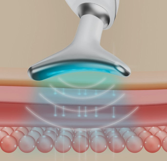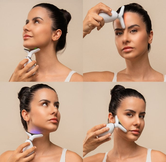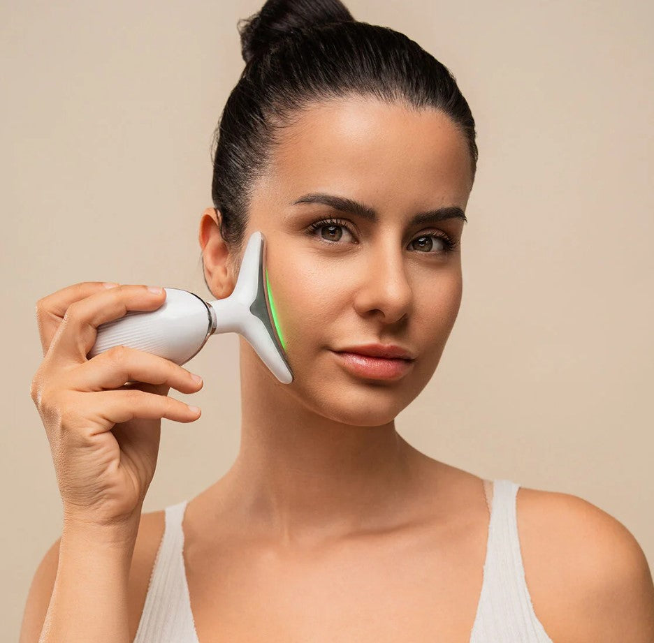 - EMS‑mikrosähkö: stimuloi kasvojen ja vartalon syvempiä lihaskerroksia, edistää kiinteyttä ja kohottaa ihoa.